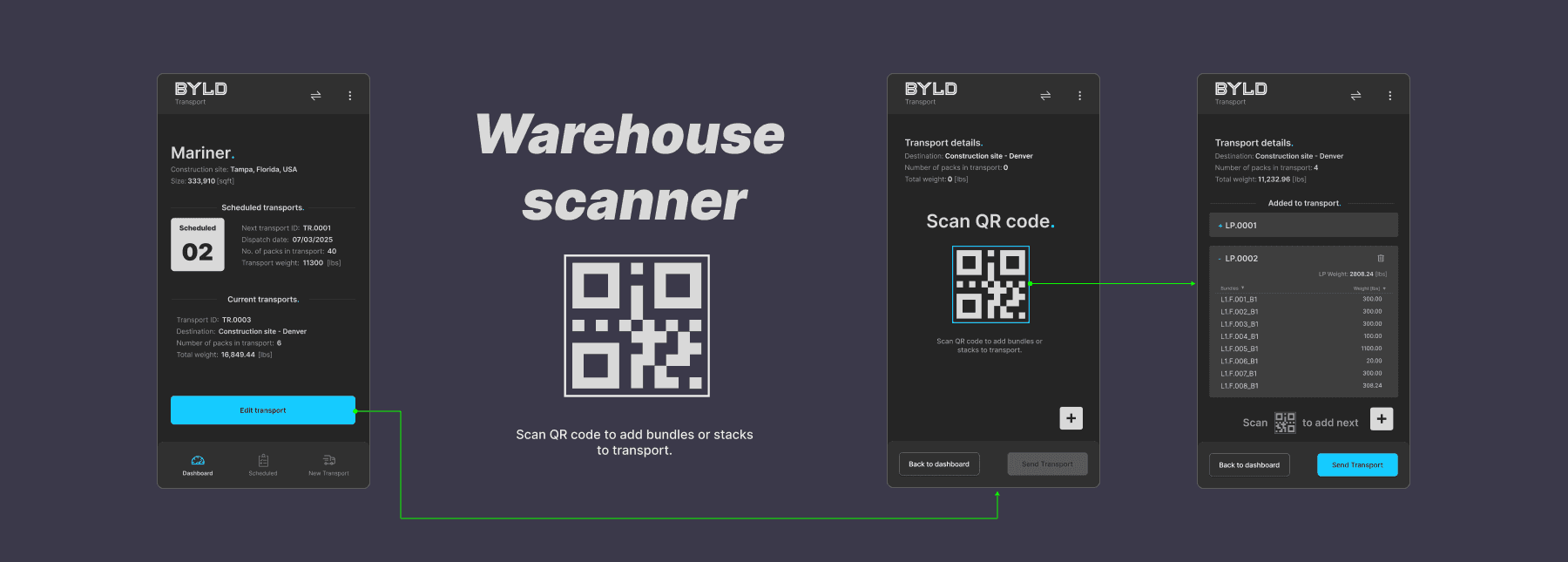 A scanner-first application enabling material tracking through QR codes.Part of a larger system supporting warehouse operations, transport, and production workflows.