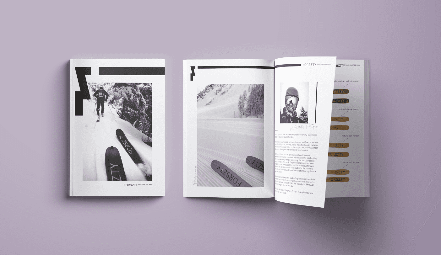 A printed product catalog designed for a small manufacturer of handcrafted wooden skis. The project focuses on clear product presentation, storytelling, and translating a physical product into a coherent visual system.